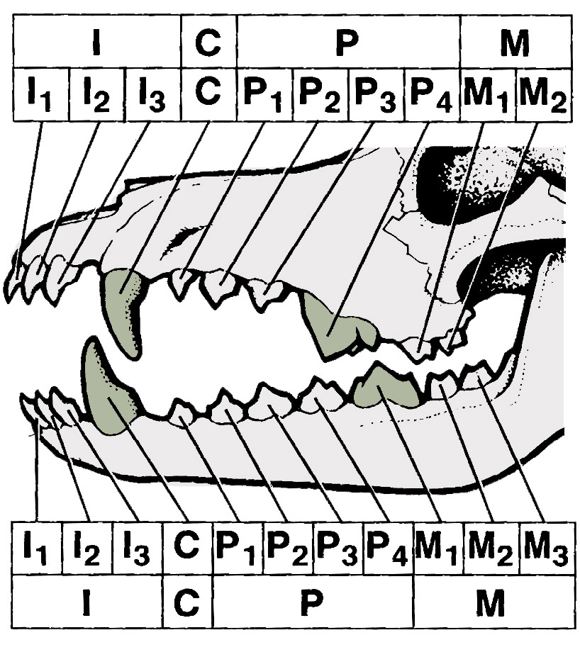 Besonders kräftig ausgebildet sind die sogenannten Reißzähne. Im Oberkiefer ist das der P4 (4. Prämolar) und im Unterkiefer der M1 (1. Molar).