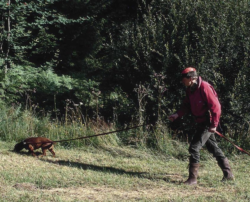 Im Gegensatz zum Niederwild wird die Nachsuche auf Schalenwild in der Regel erst nach 2 bis 3 Stunden Wartezeit ab dem Schuss durchgeführt. Das Wild soll erst stärker krank und die Fährte kalt werden.