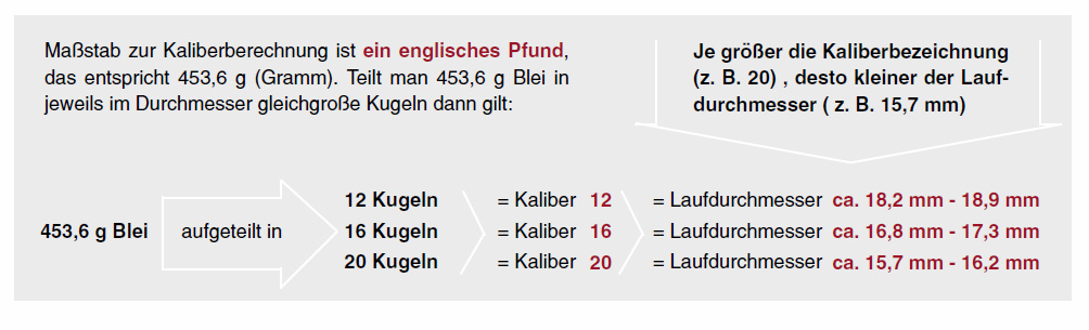 Die Art der Kaliberbezeichnung bei den Schrotpatronen stammt aus dem Englischen und ist international. Bei Flintenläufen ist jedoch die Kaliberbezeichnung mit dem Laufdurchmesser nicht identisch und wird berechnet.