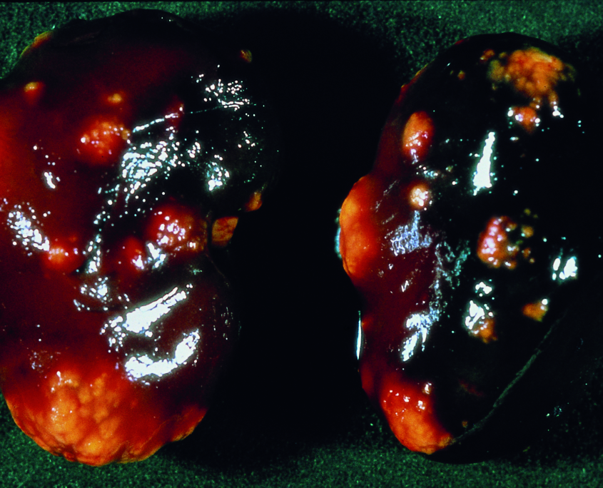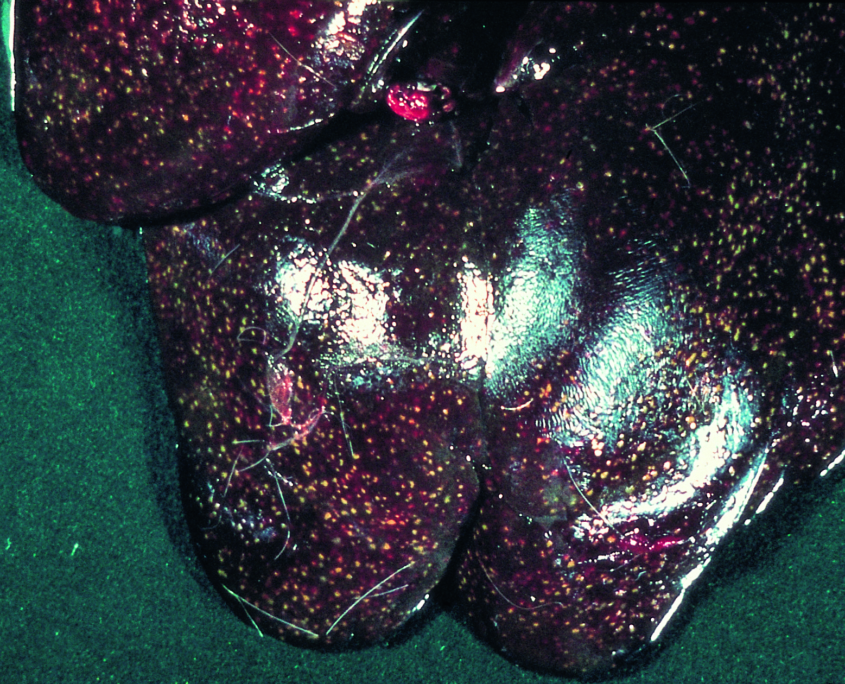 • vergrößerte Leber und Milz mit zahlreichen gelben Punkten