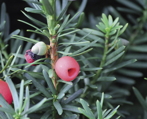 immergrüner Nadelbaum mit 2-zeilig angeordneten Nadeln (Seitenzweige); Rinde anfangs rotbraun, dann graubraun; männliche und weibliche Pflanzen, Früchte als rote „Beeren“; alle Teile (mit Ausnahme des roten Samenmantels) sehr giftig!