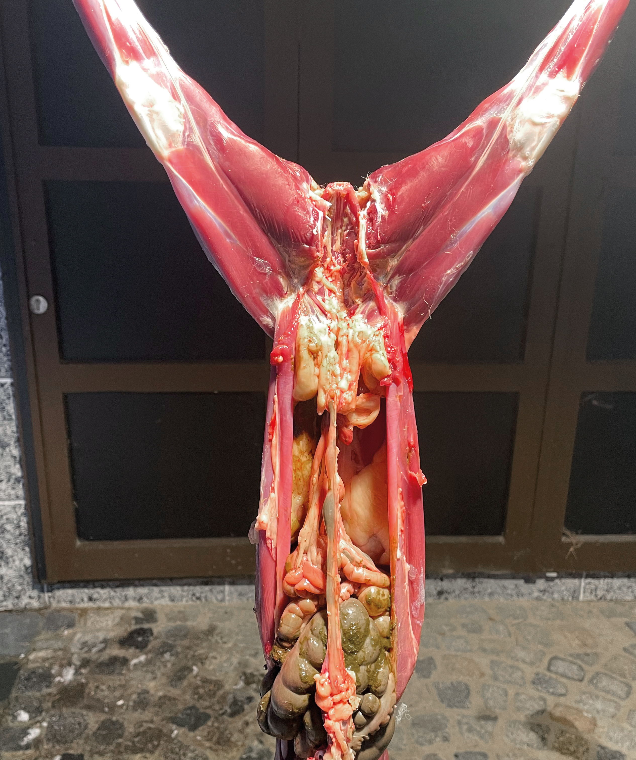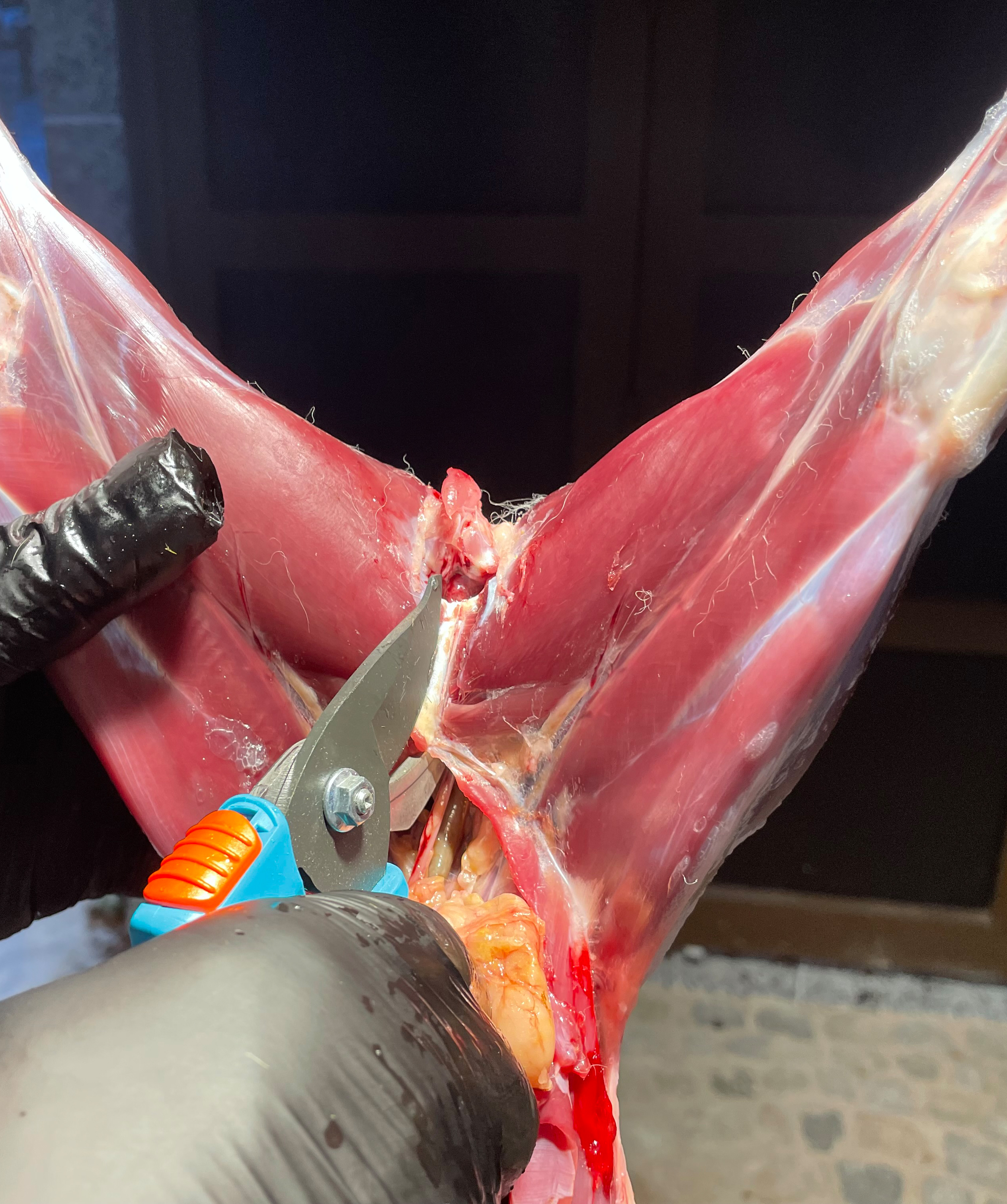Blase und Weiddarm werden entfernt, ebenso die Geschlechtsteile.