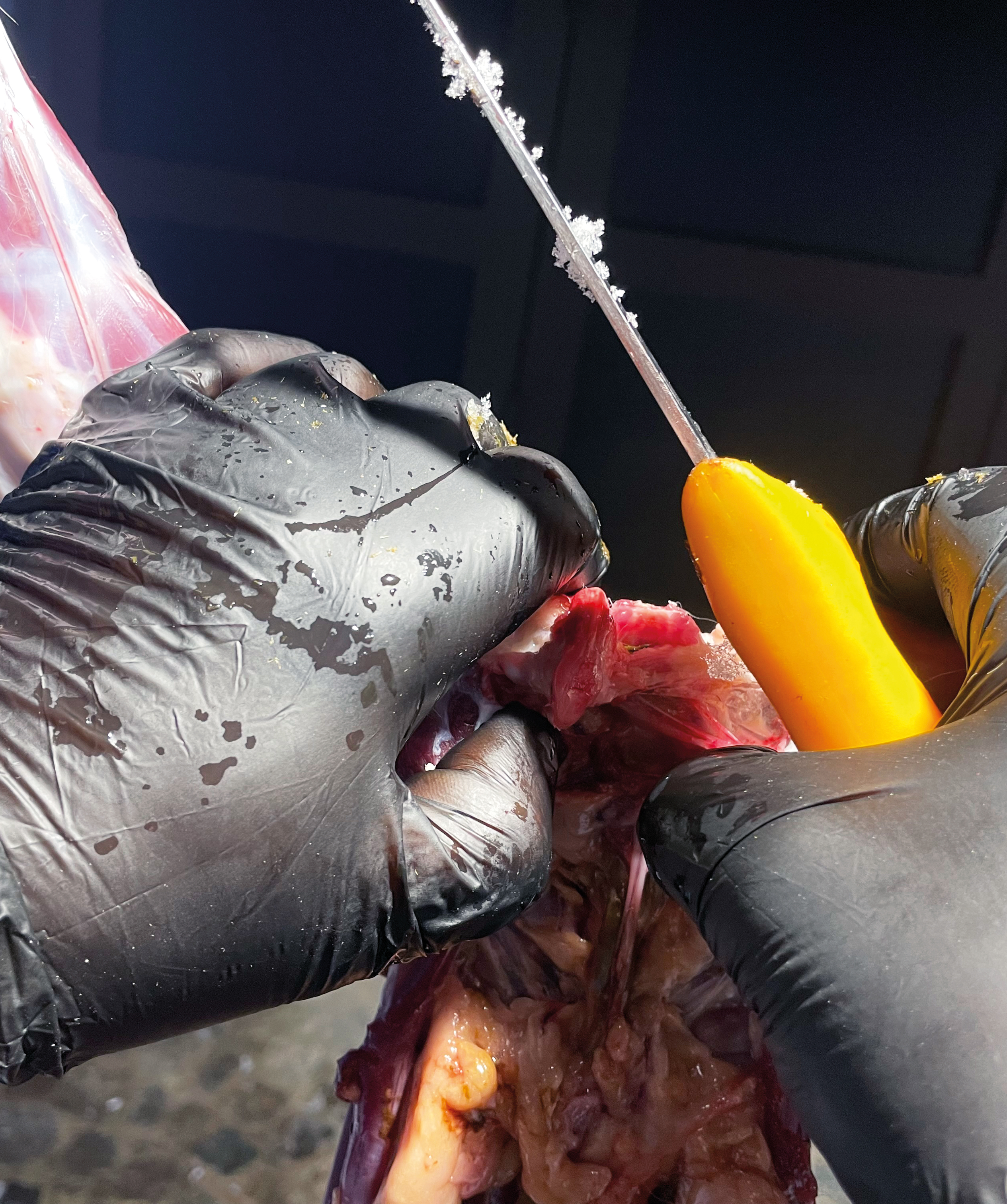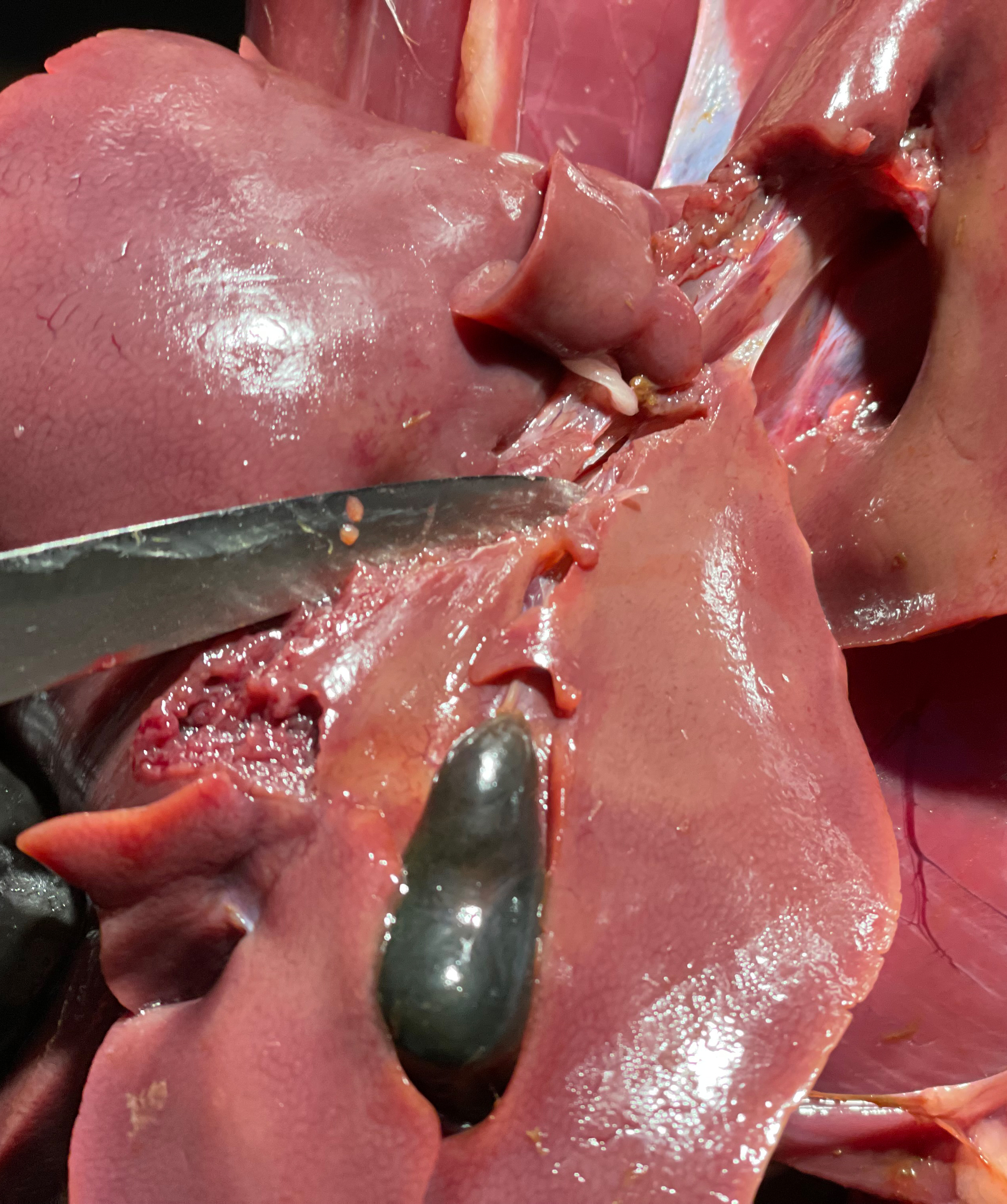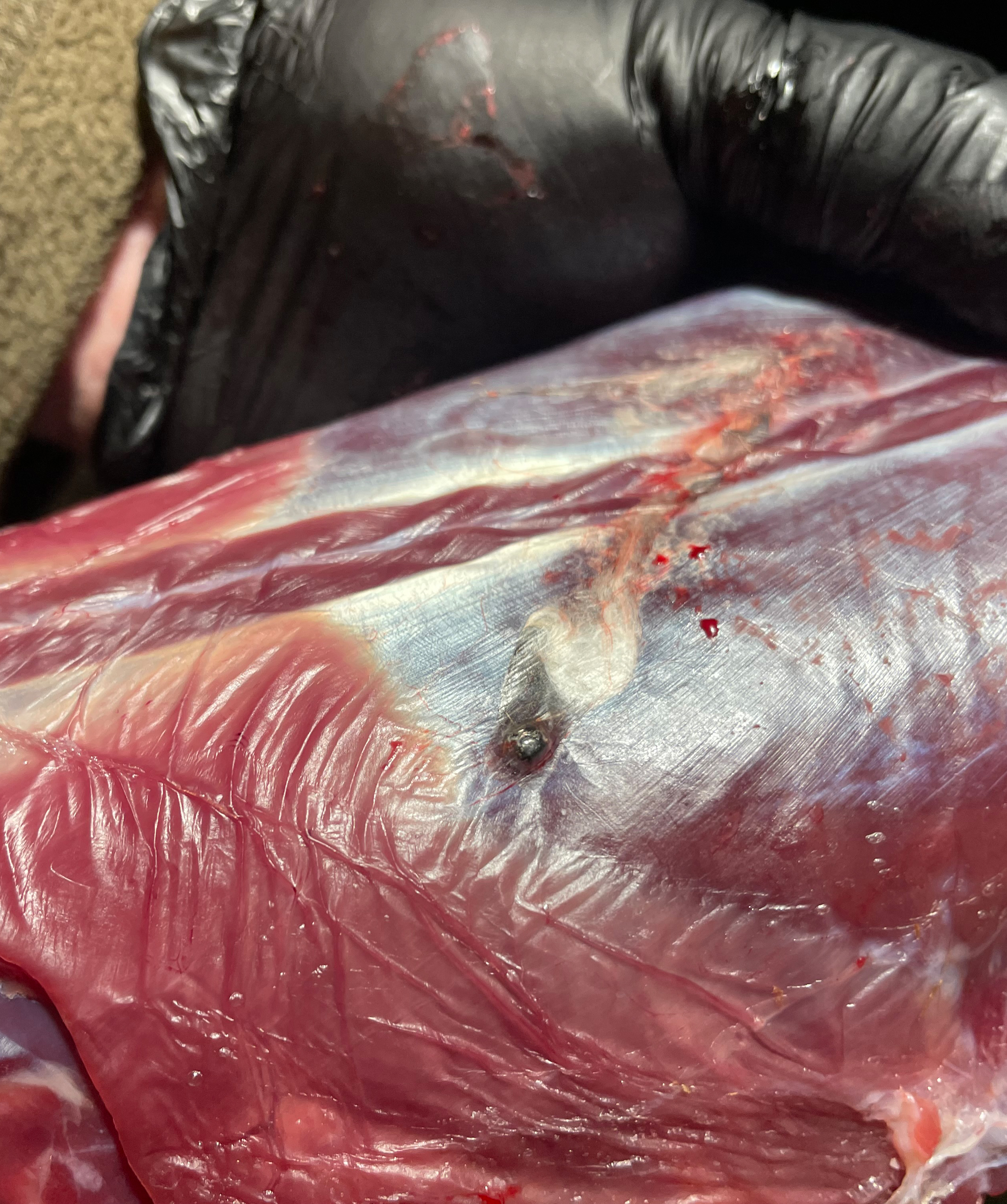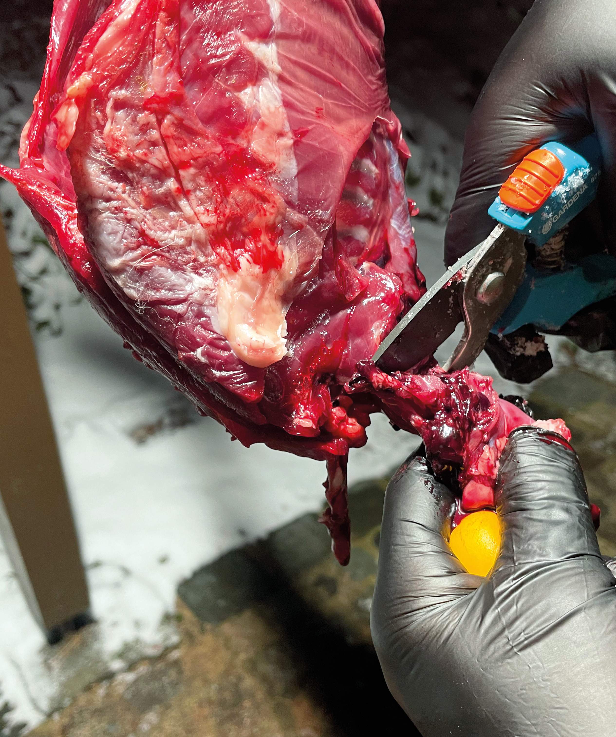Hier sieht man das durch einzelne Schrotkörner verletzte Gescheide.