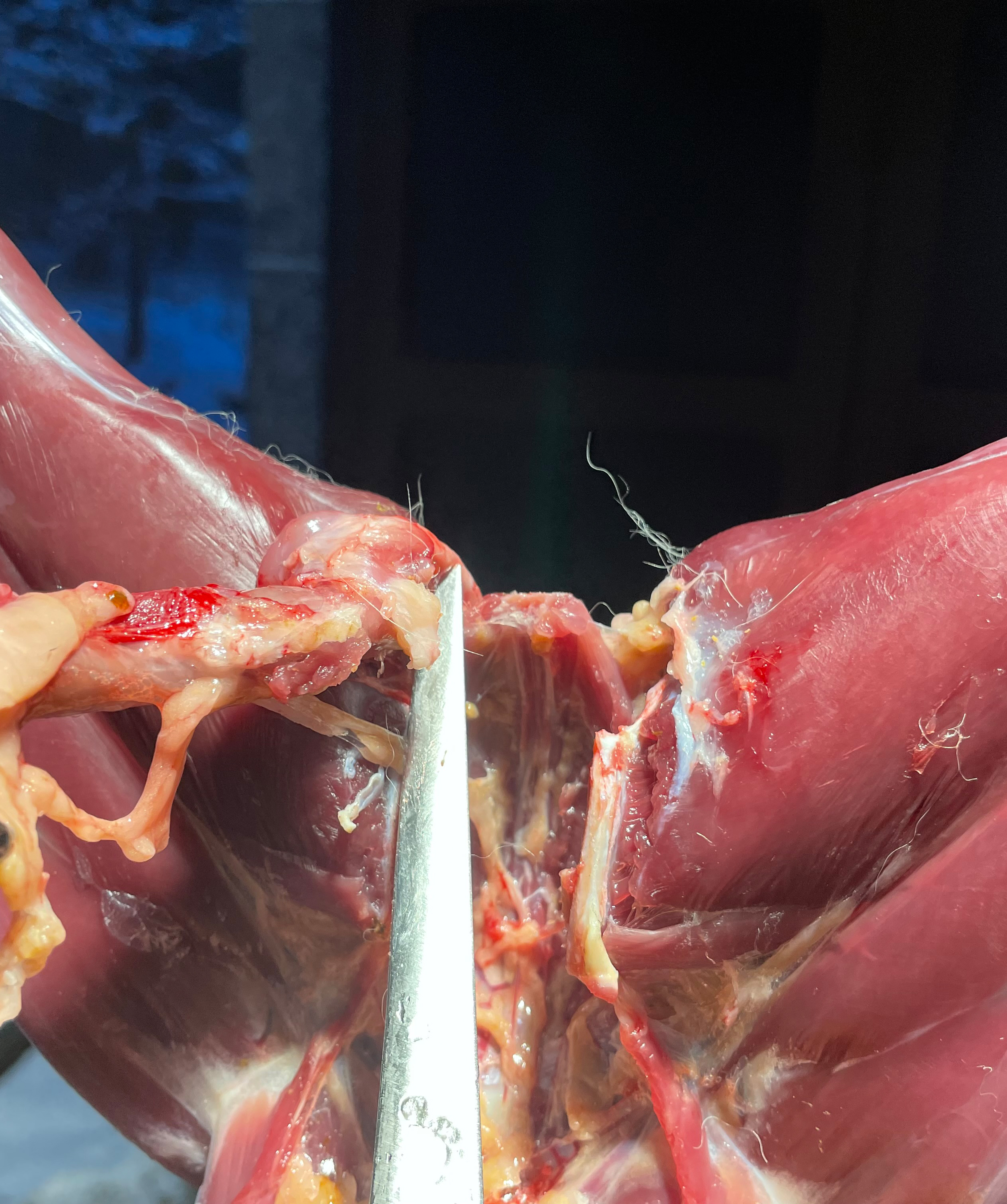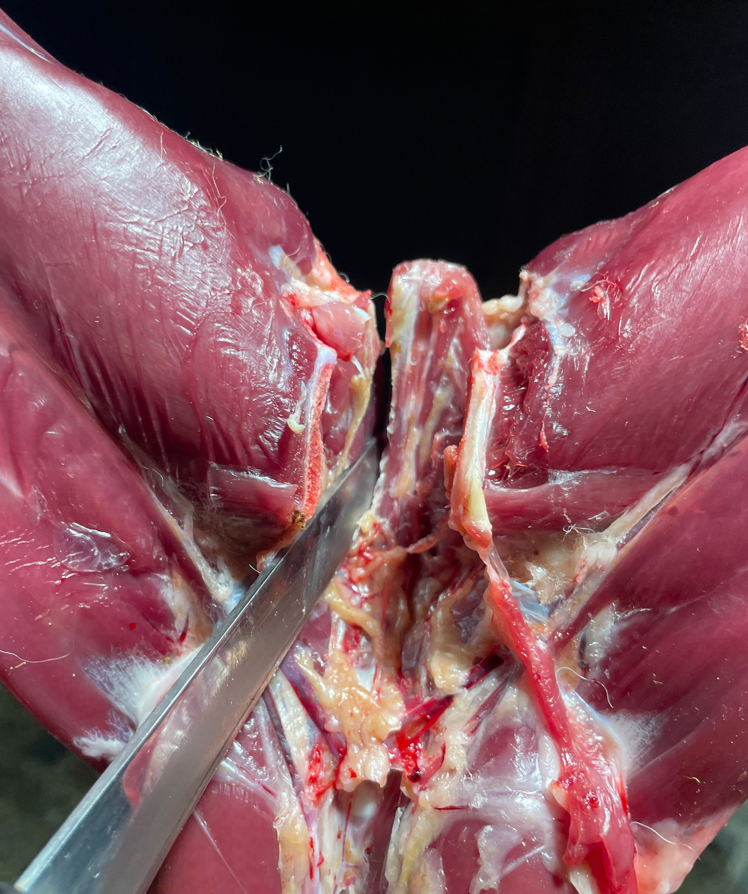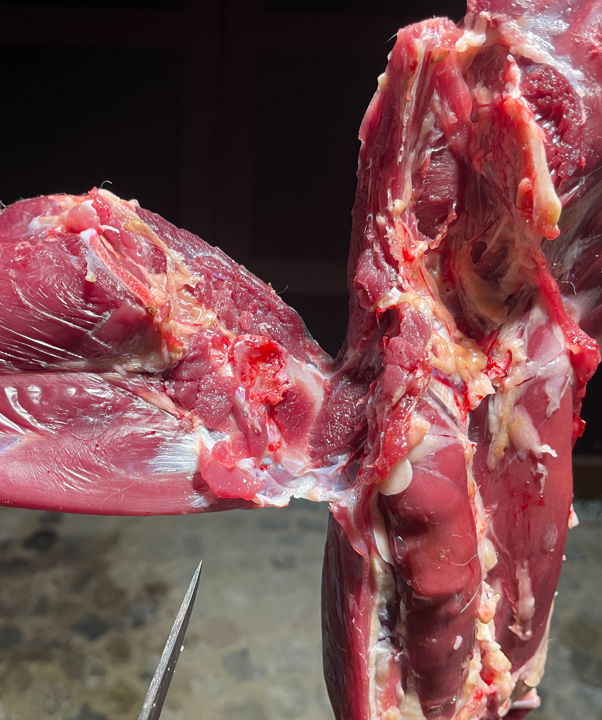 Dann wird die Keule seitlich abgebogen bis sie vom Beckenknochen abbricht.