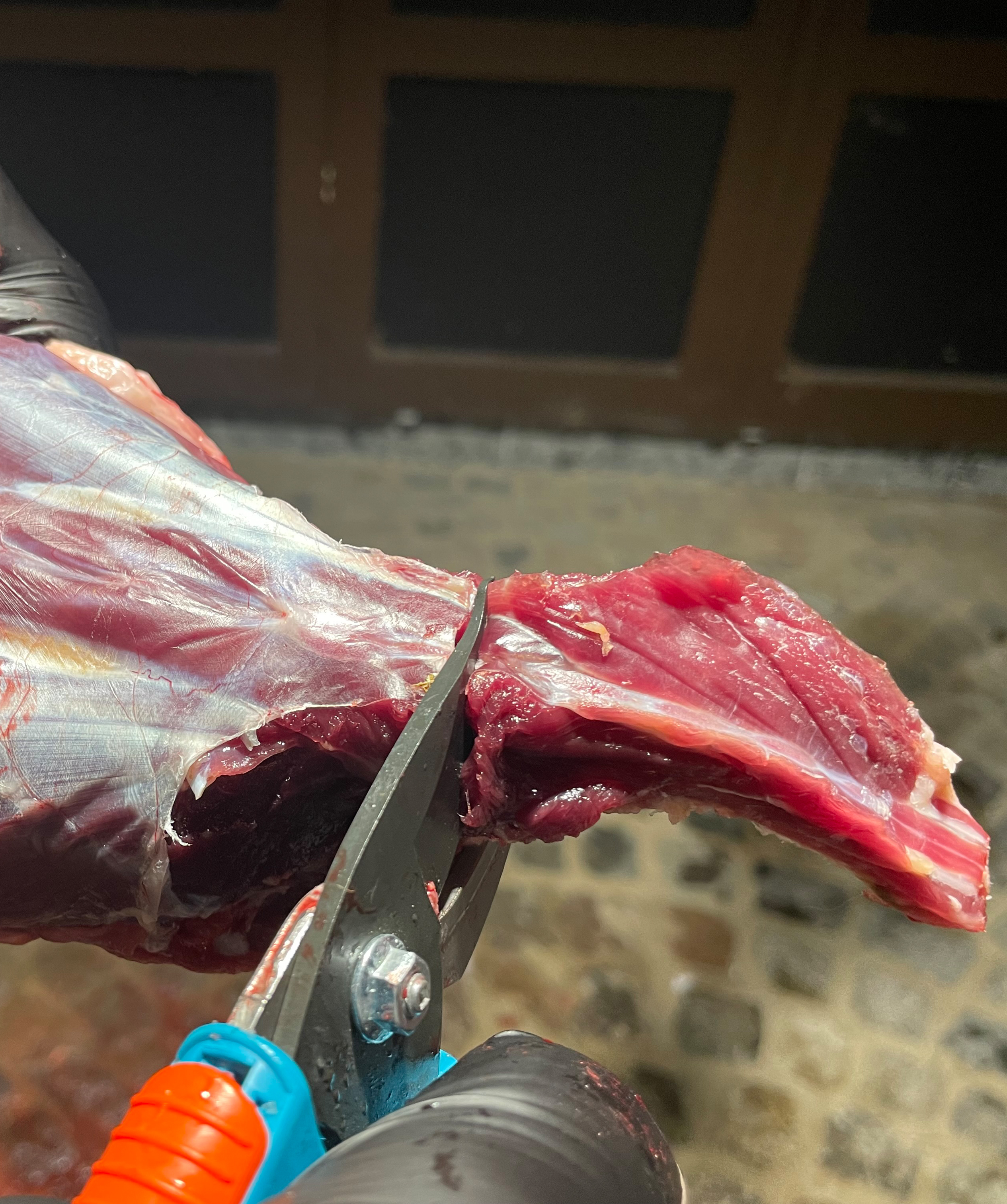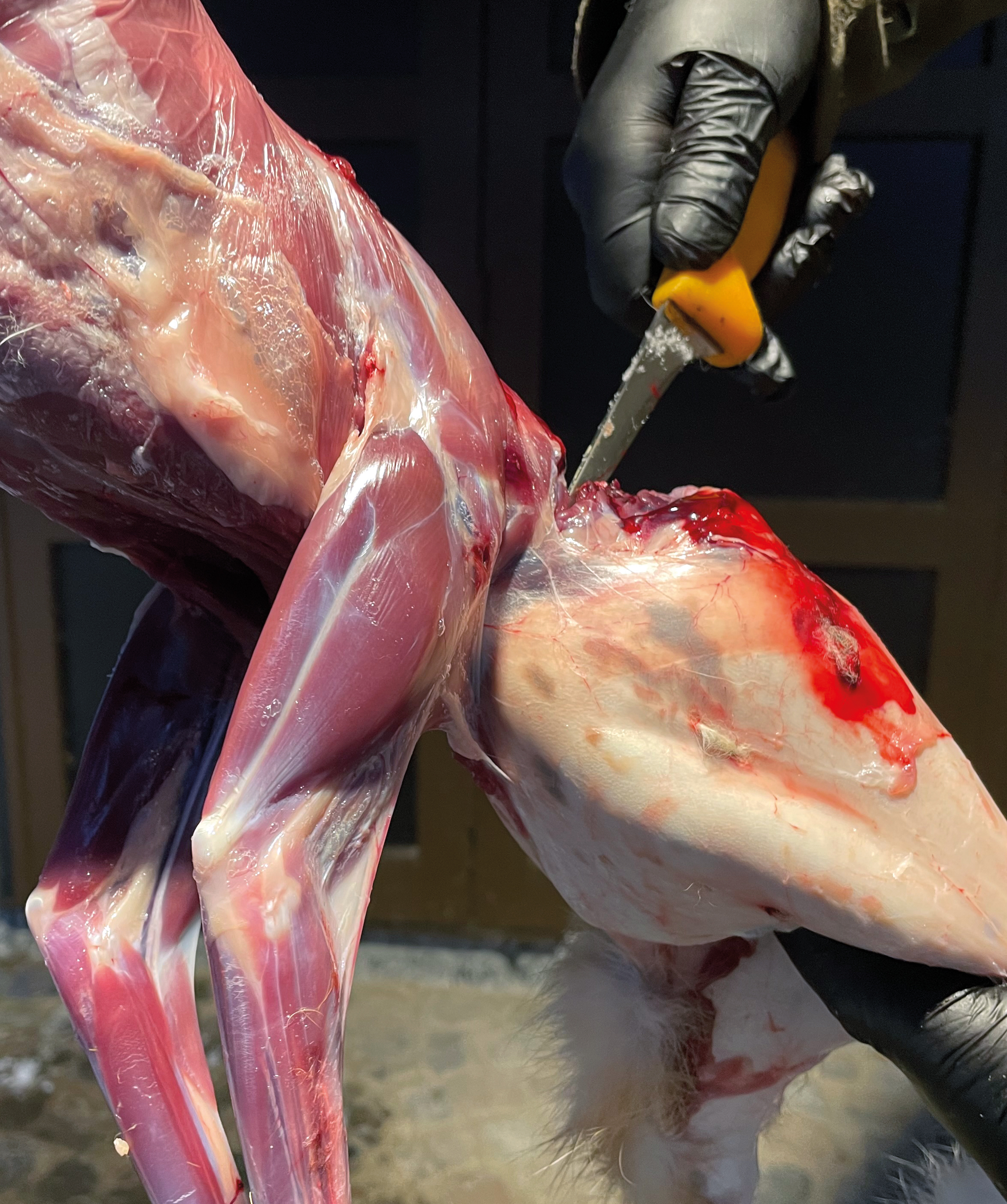 Von der abgelösten Keule wird nun die Pfote mit der Schere entfernt.