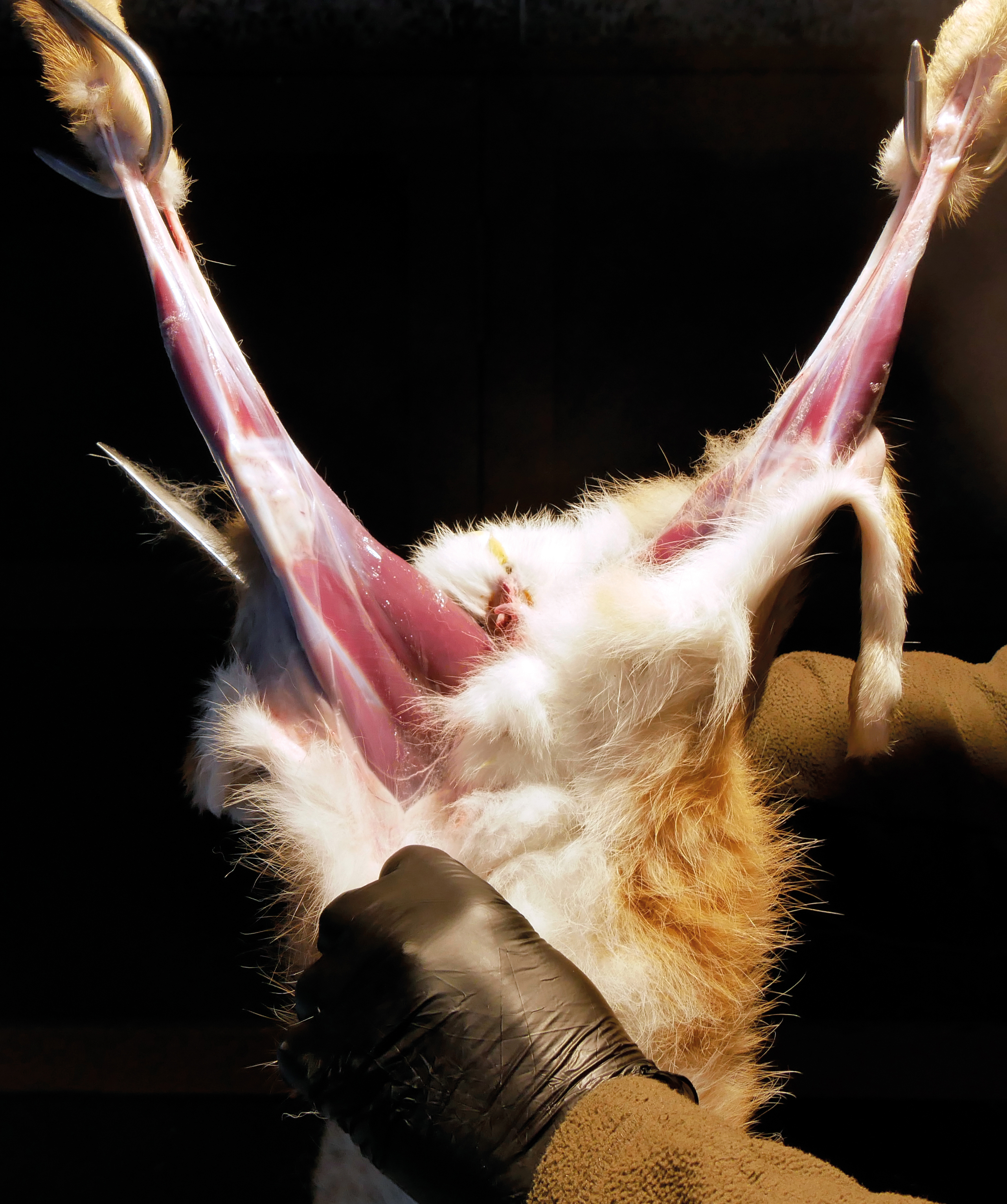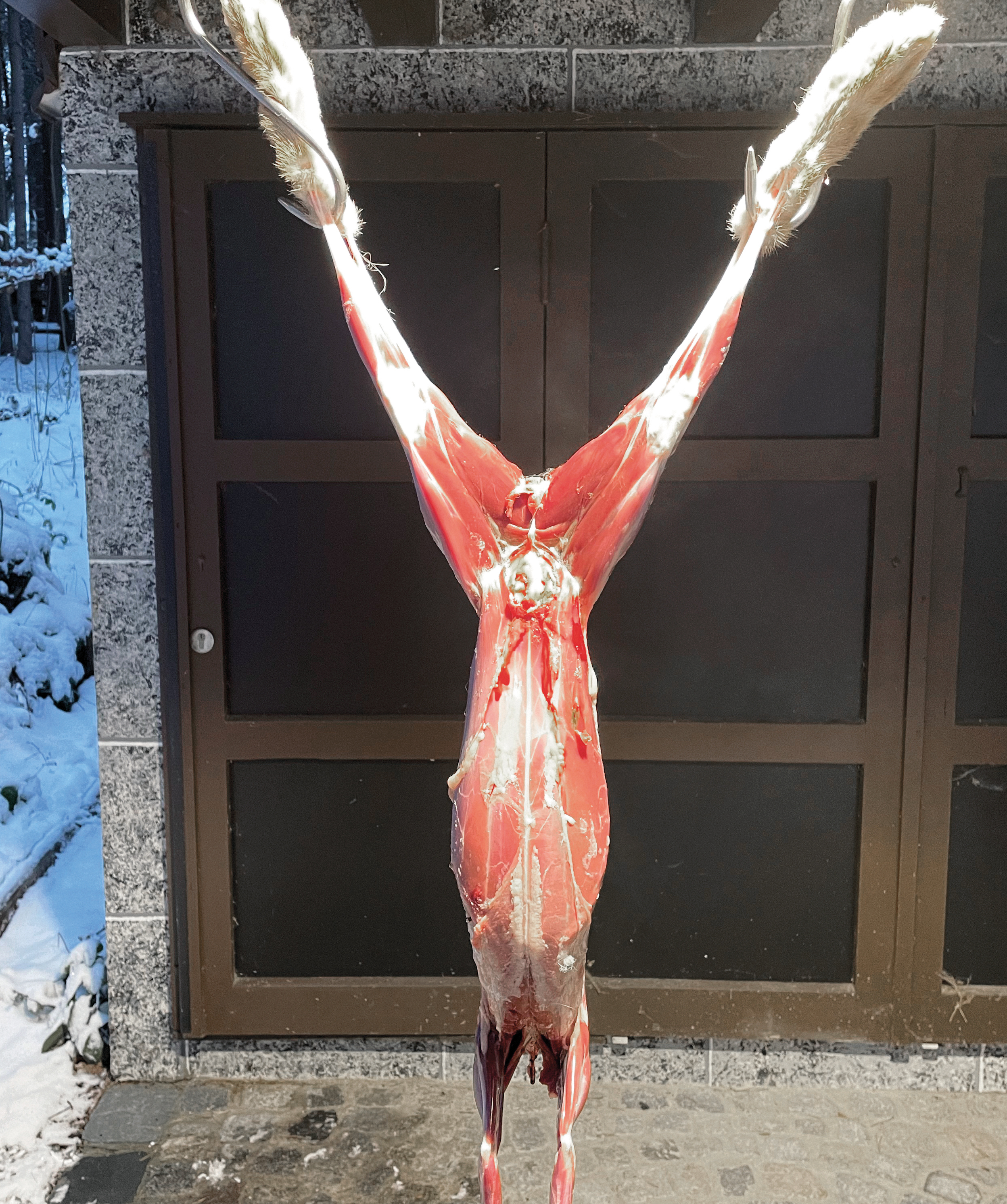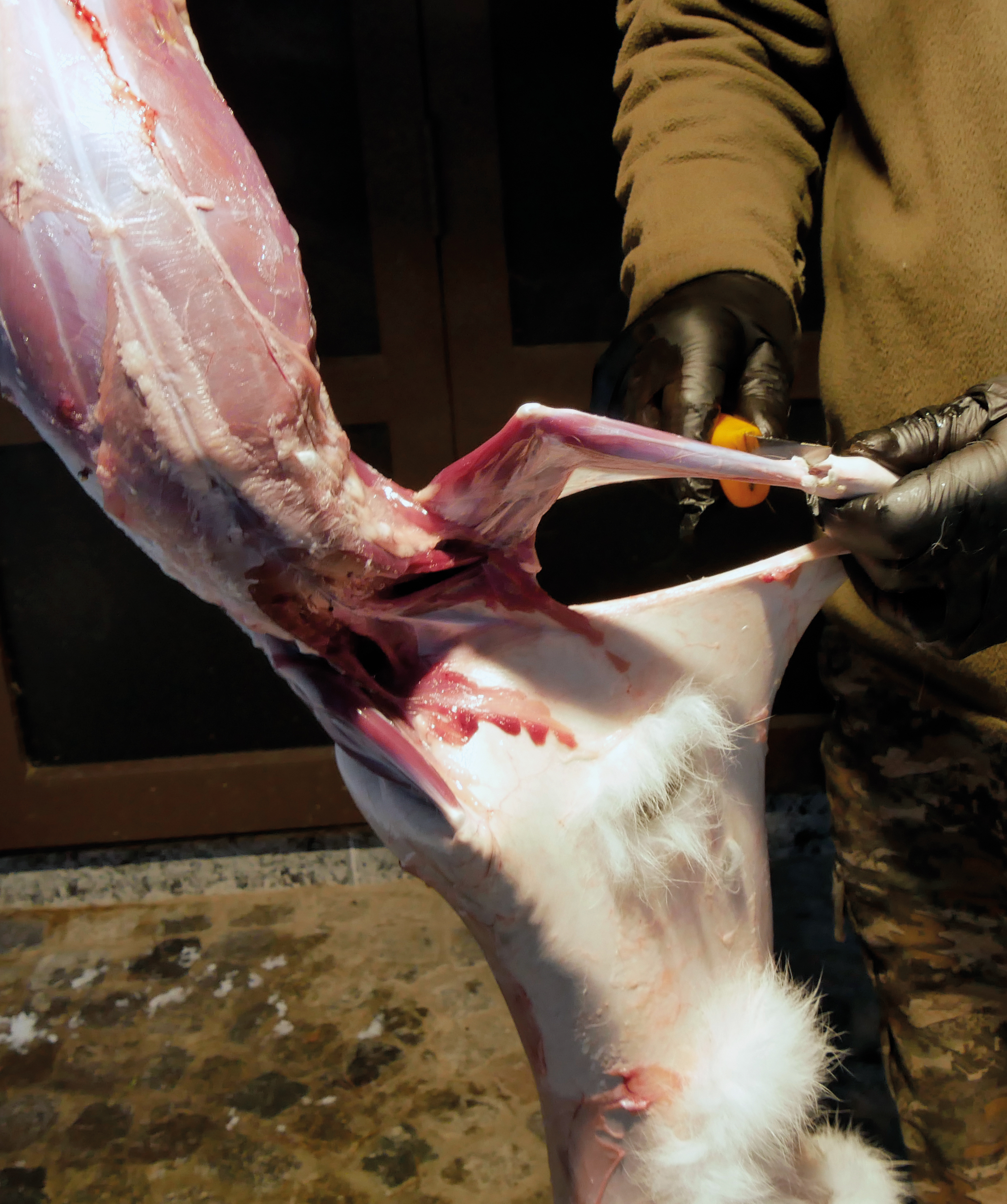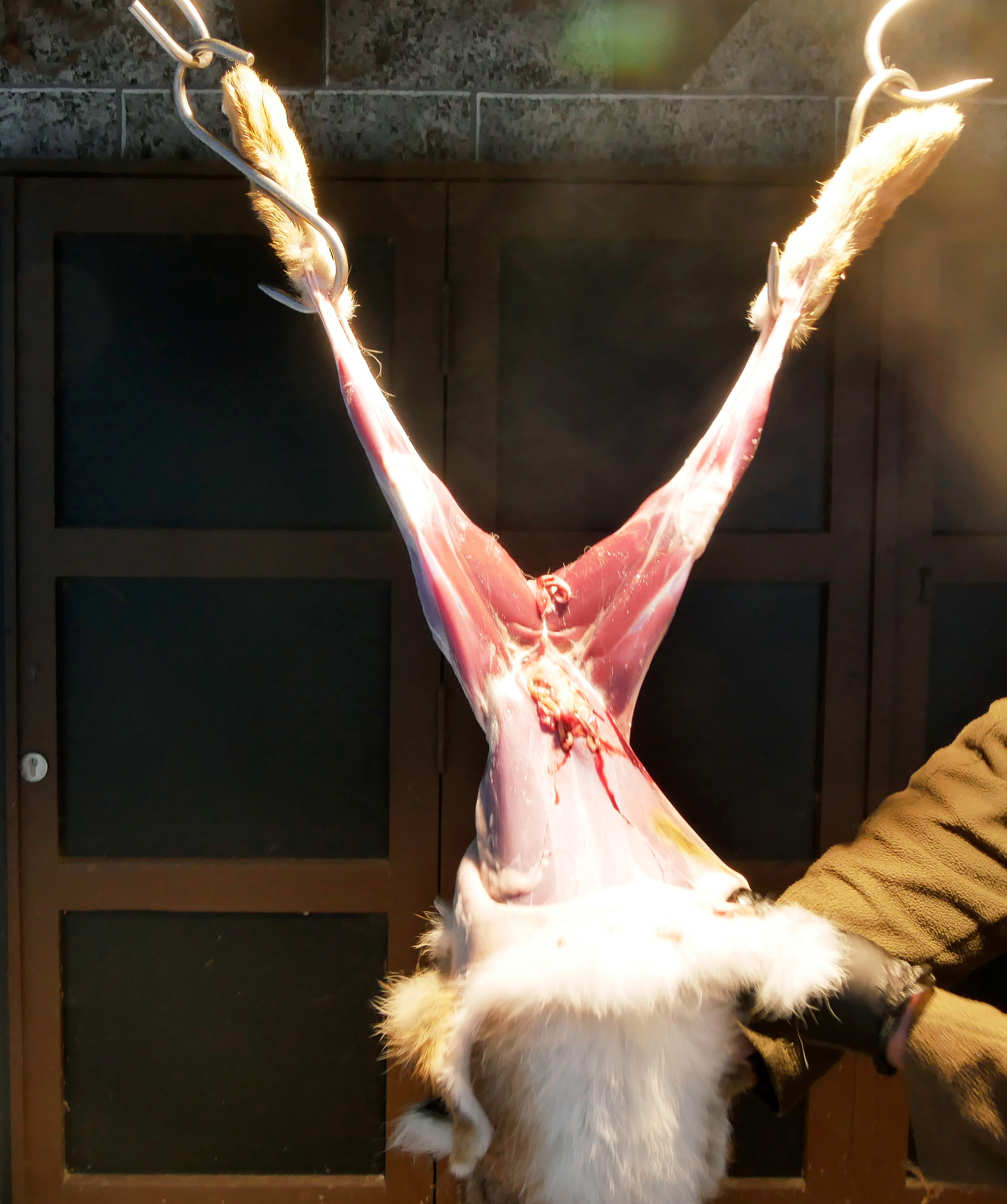 Hasen an einem Fleischhaken aufzuhängen. Der Schnitt verläuft